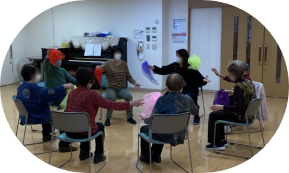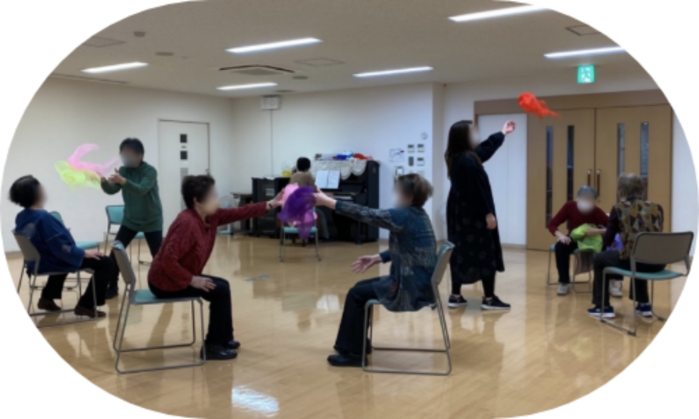 音楽は即興演奏からよく知る懐かしい歌へ。 みなさん自然に歌を口ずさみます。 歌を歌いながら動くことは楽しいですが、同時に、とても難しいことに気が付きます。 この日は、腰が痛い方や、息切れしてしまい、途中で座った方がいたので、立って動く活動は短めでした。